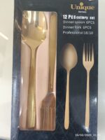 یونیک در تولید قاشق و چنگال بسیار موفق عمل کرده.قاشق وچنگال طلایی 12 پارچه نیز یکی آن هااست. که از پرفروش ترین این محصولات است و در 2 طرح مختلف ارائه داده.قاشق و چنگال هایی از جنس استیل طلایی که هرگز سیاه نمی‌شوند و زنگ نمی‌زنند.دارای ضخامت 3 میل هستند و به راحتی قابل شستشو بوده. این ویژگی ها باعث شده که خیال مشتری از بابت خرید این محصول کاملا راحت باشد.